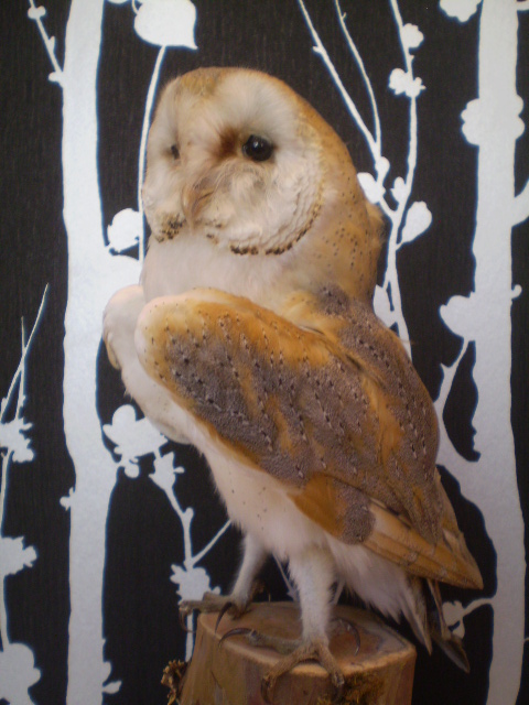 I always like my gallery window to reflect the changes of season and to be topical- so this year I've gone for an owl theme, with a stylishly spooky mood. I've selected delectable silk scarves printed with "punk owls" by Age of Reason and juxtaposed these with an actual stuffed barn owl. (He's on loan from my taxidermist neighbour who is licensed to deal in protected species that have met an accidental and untimely end.)